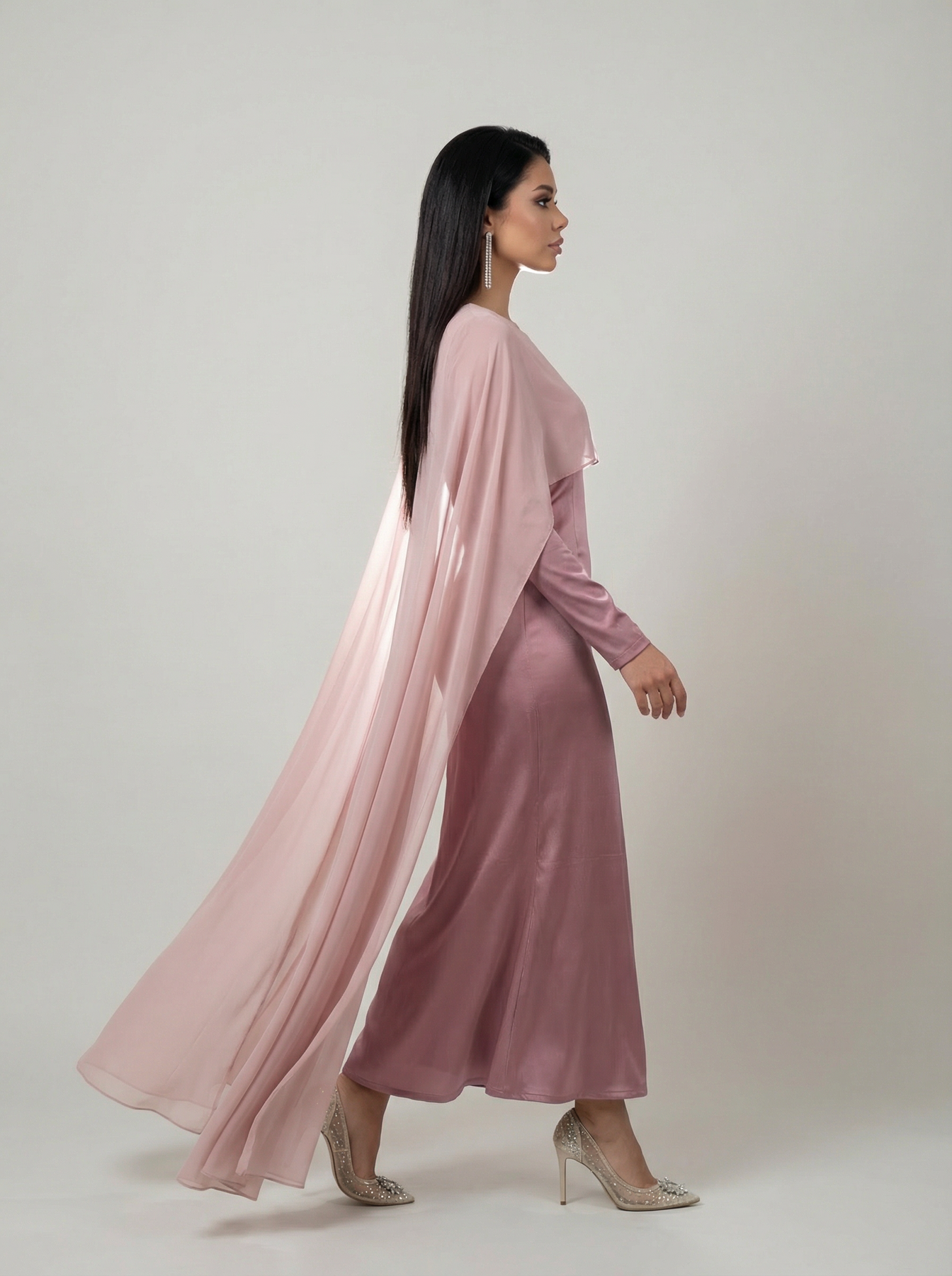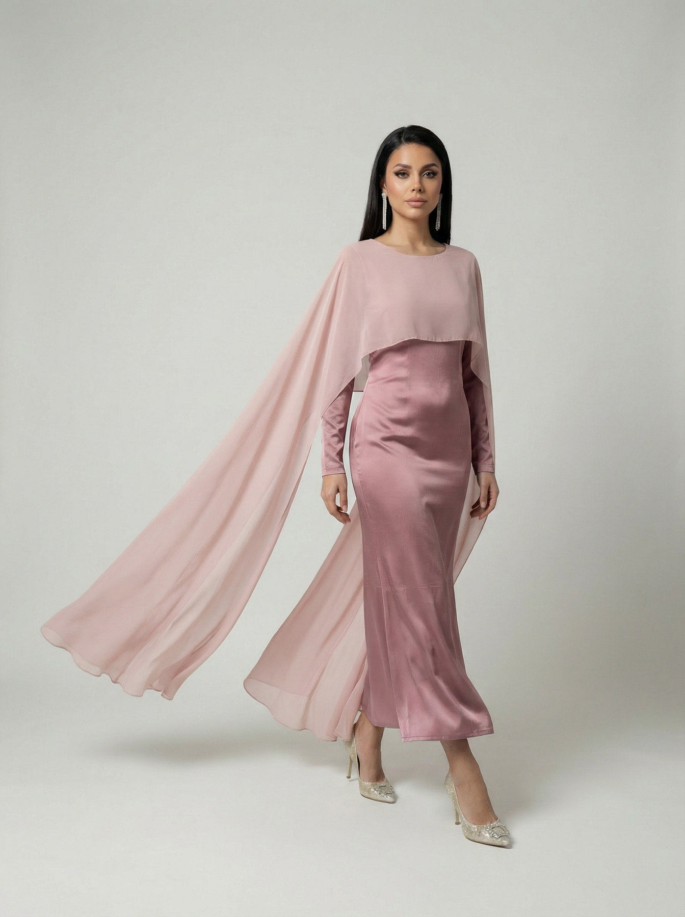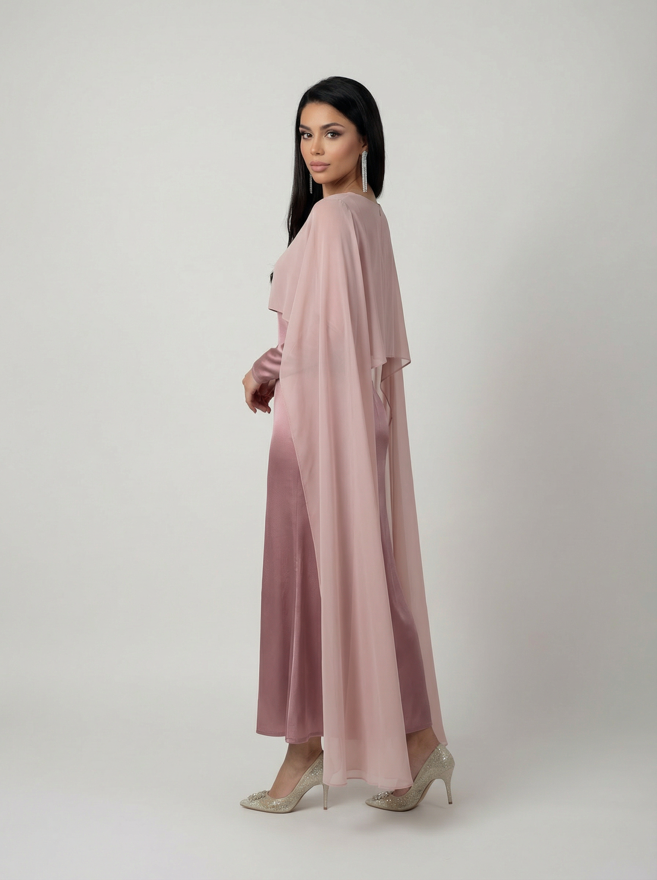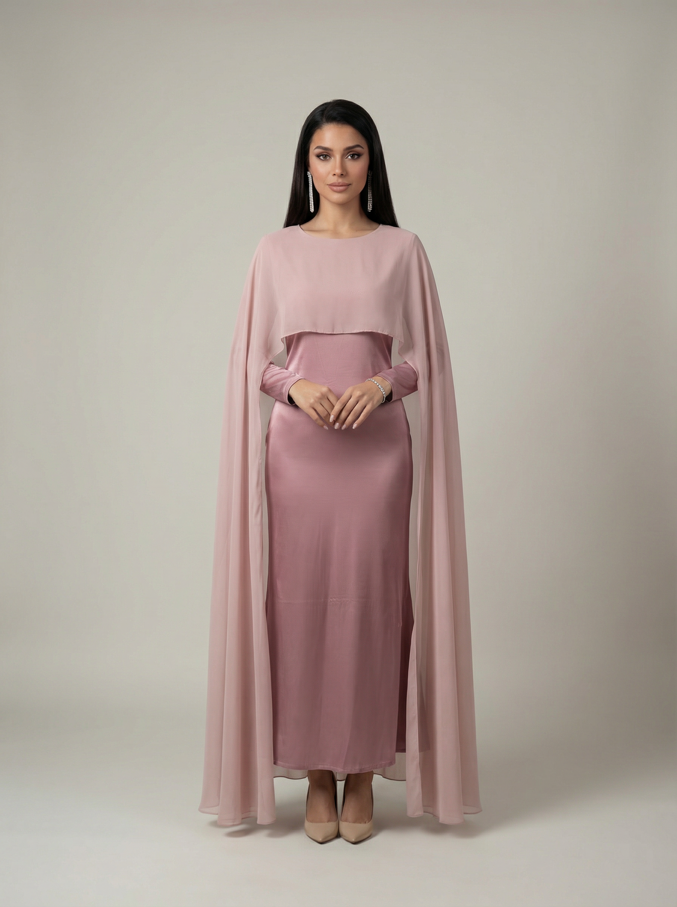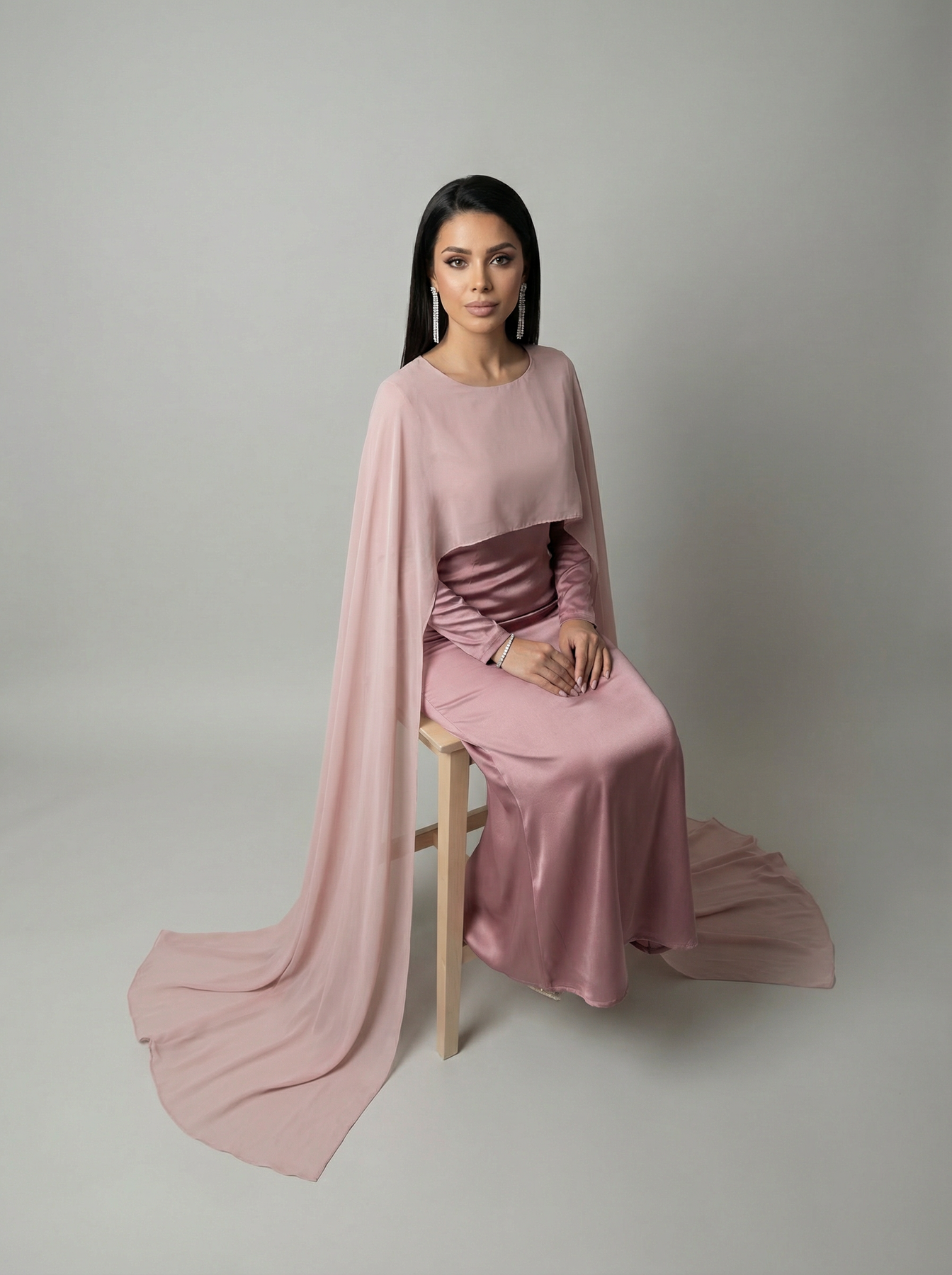 A modest satin maxi dress with a chiffon cape that brings soft movement and graceful presence to every occasion — perfect for evening wear, special events, and when you want to feel effortlessly sophisticated.