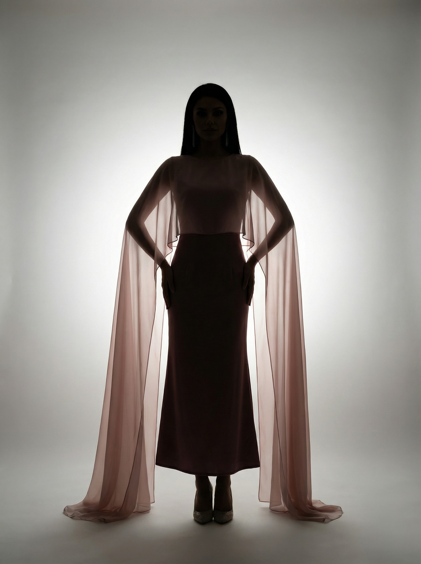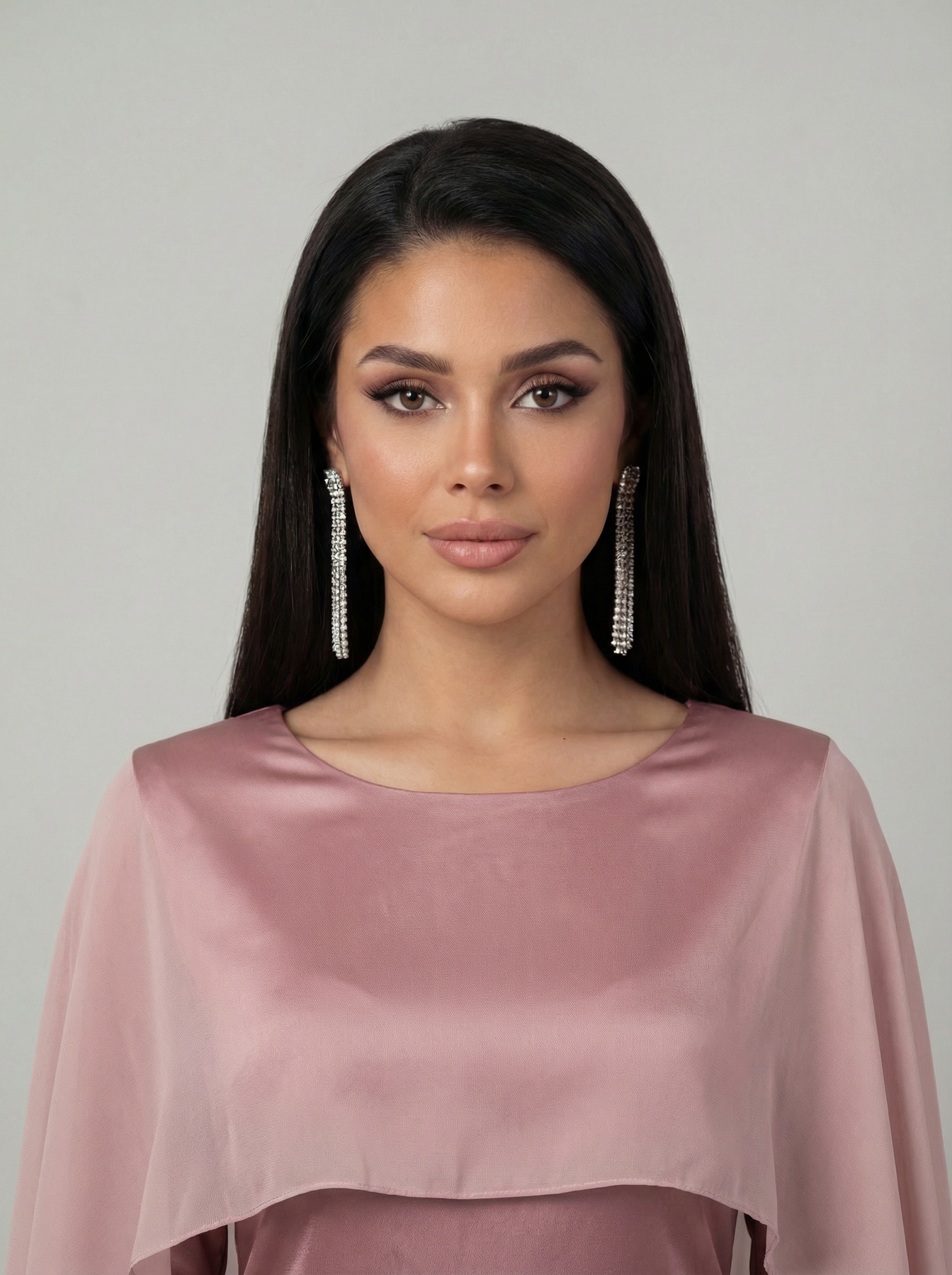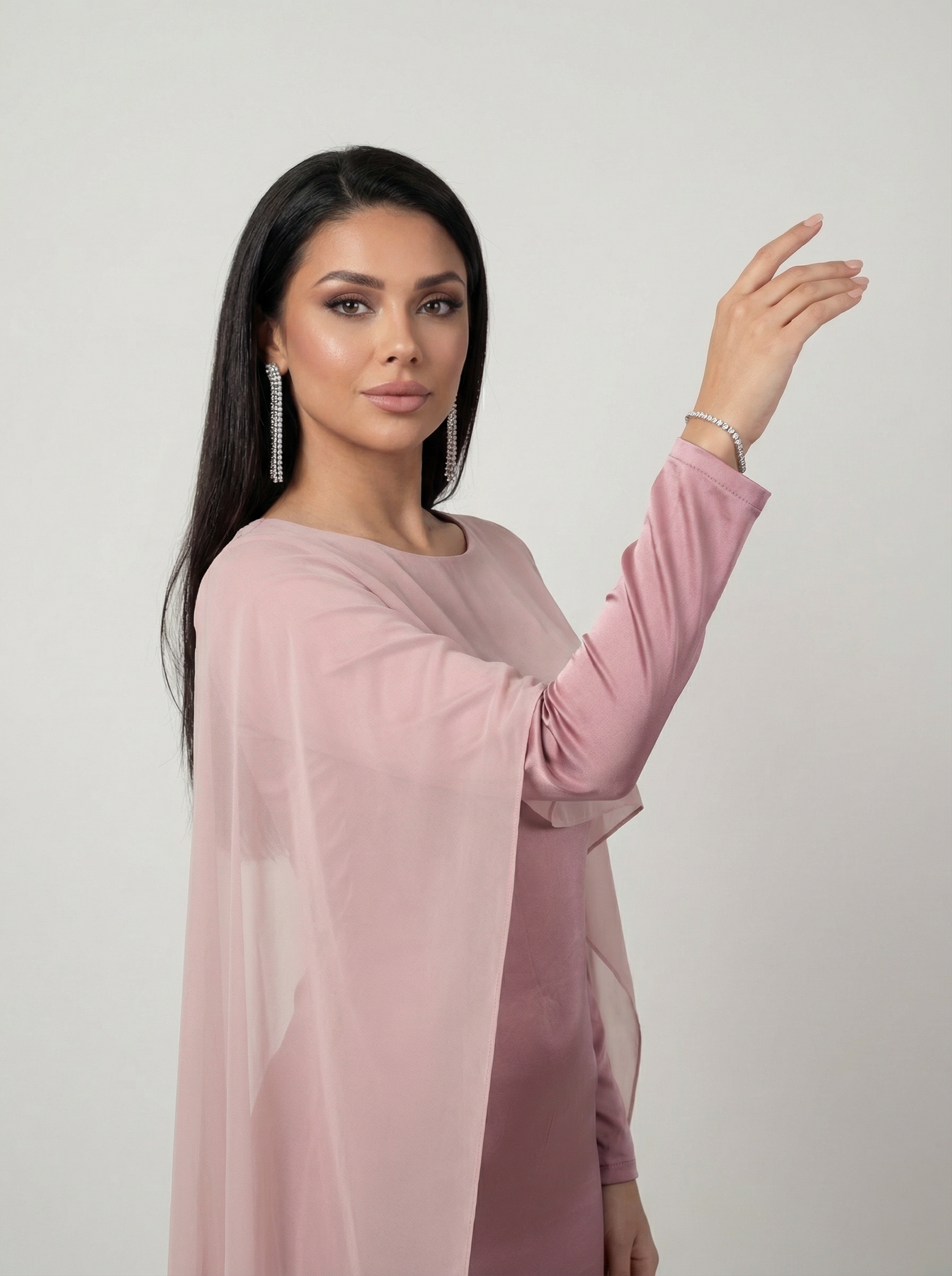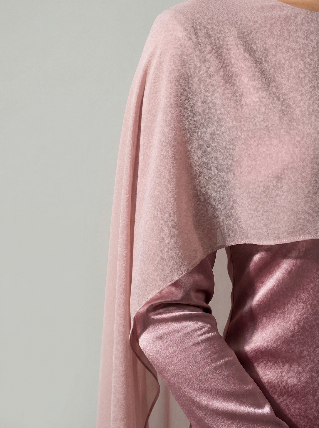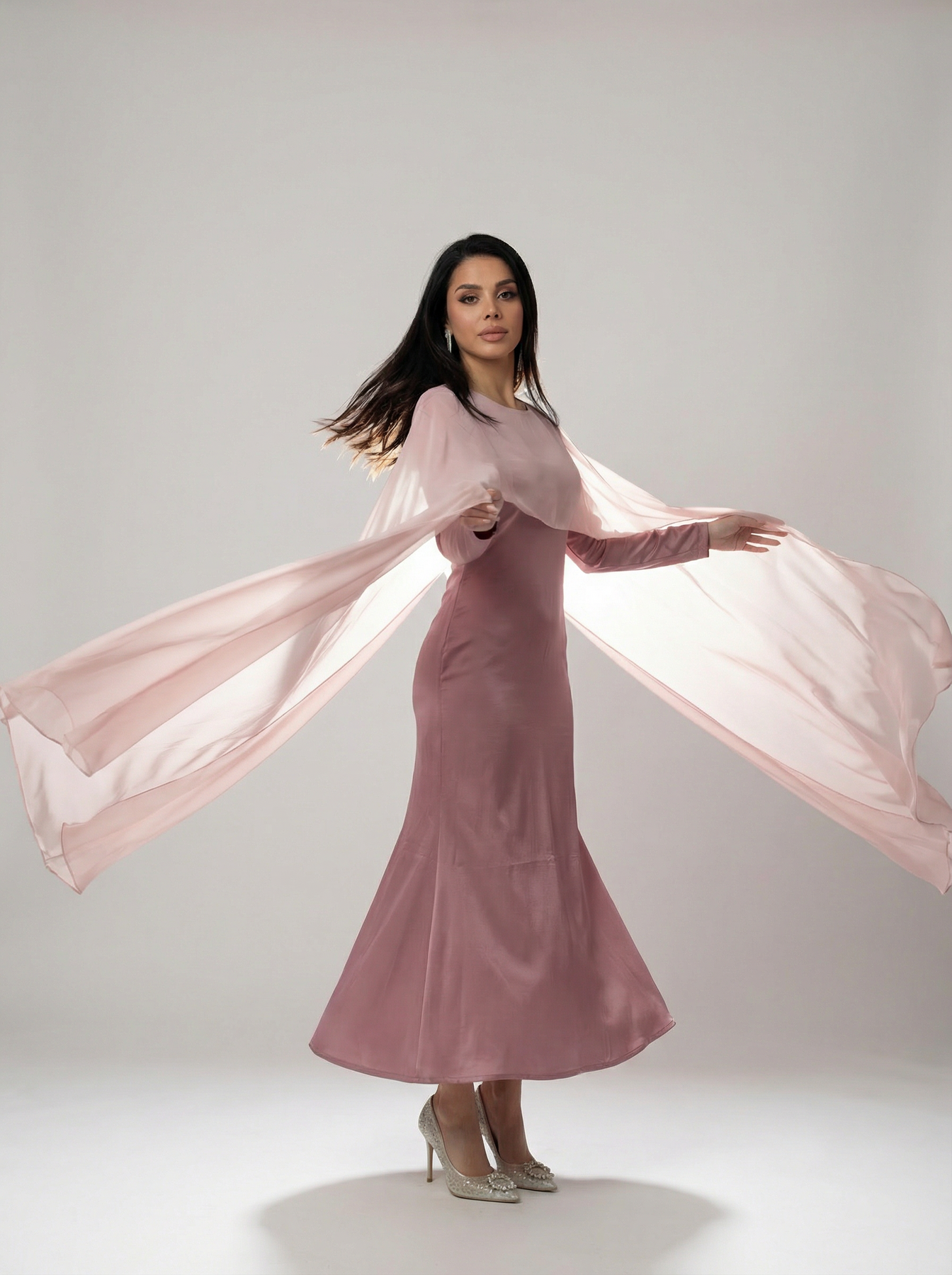 A modest satin maxi dress with a chiffon cape that brings soft movement and graceful presence to every occasion — perfect for evening wear, special events, and when you want to feel effortlessly sophisticated.
