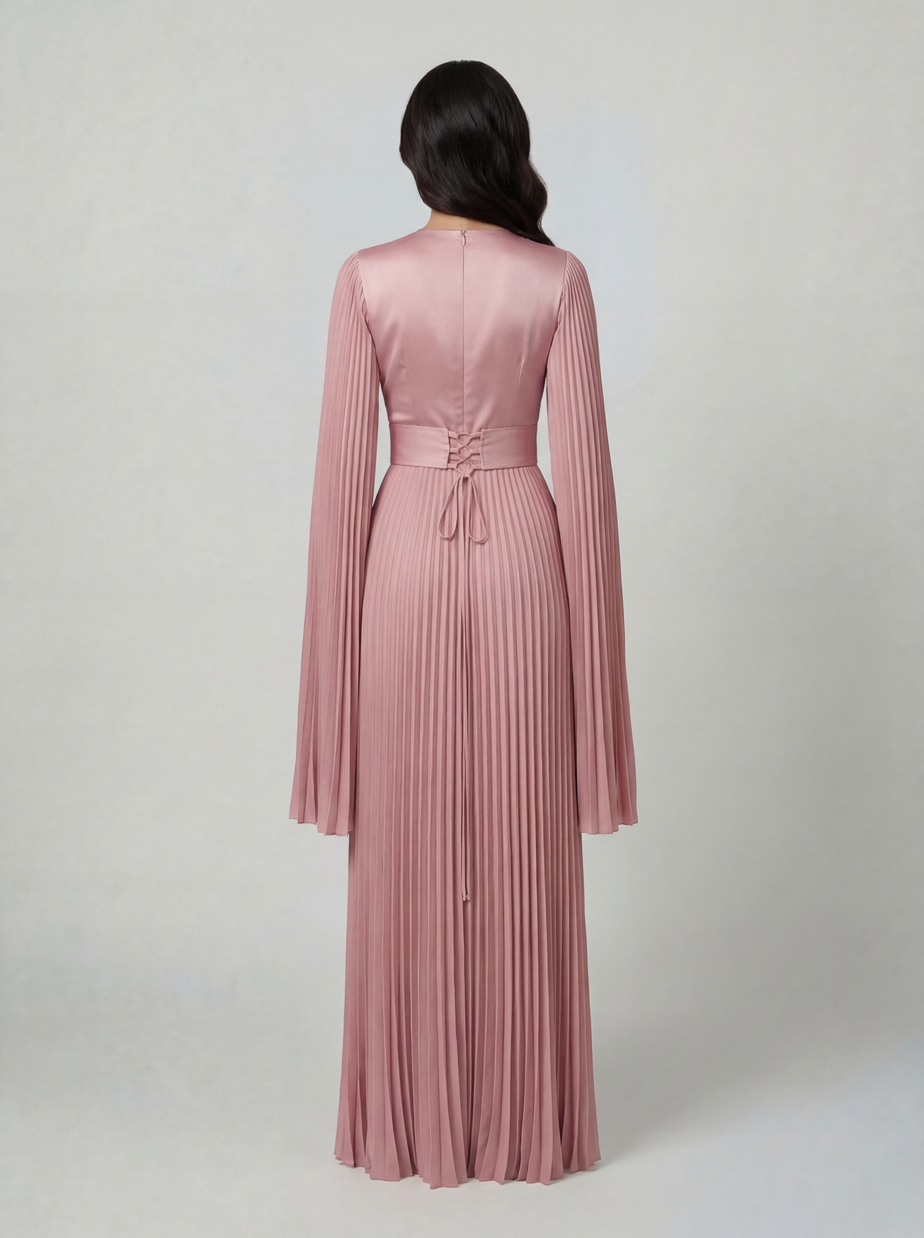 A pleated satin maxi dress that embodies refined elegance — designed to catch the light with every step while maintaining timeless modesty. Perfect for evening wear, special occasions, or whenever you want to feel effortlessly graceful.