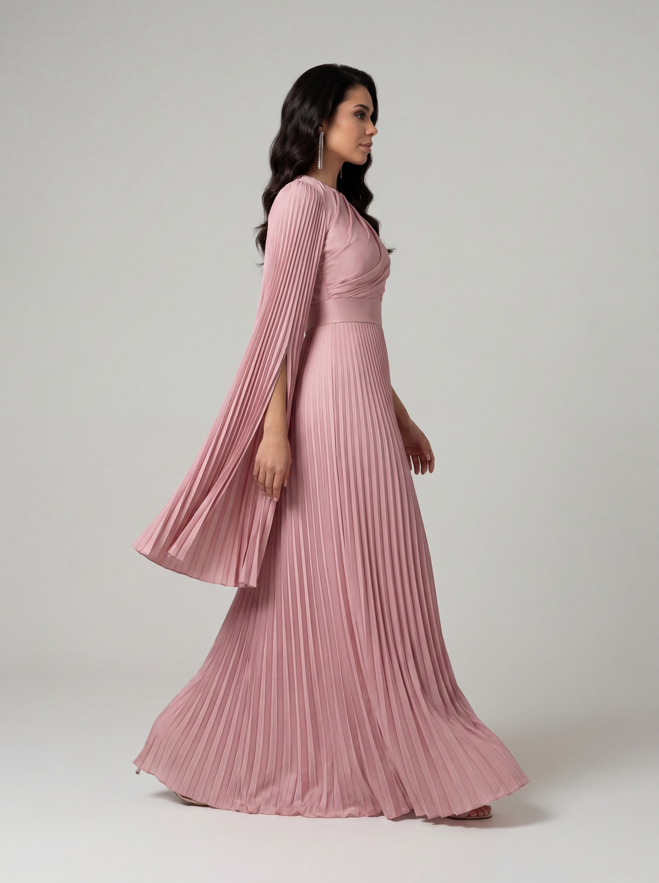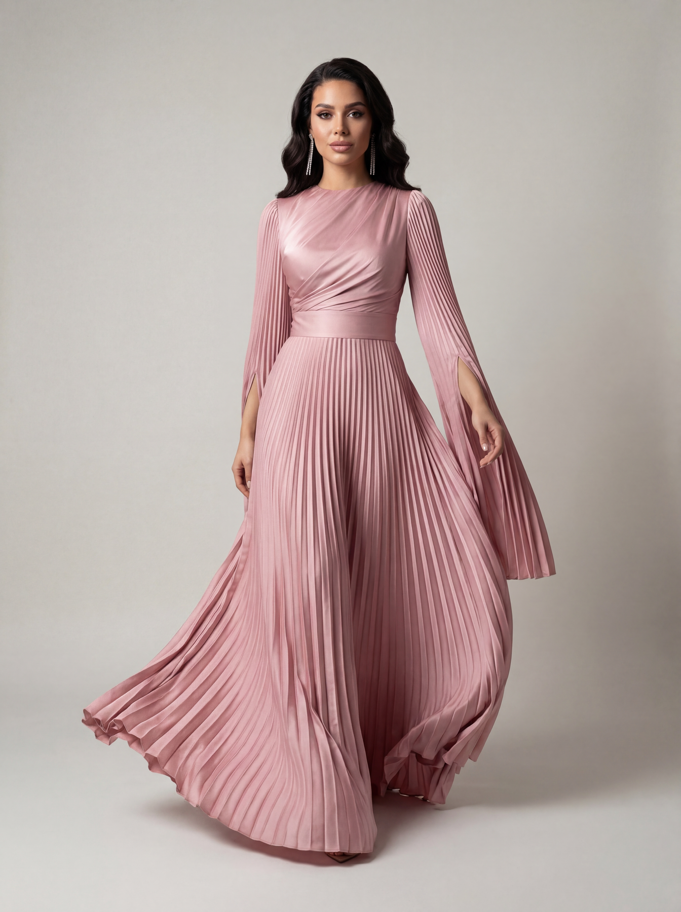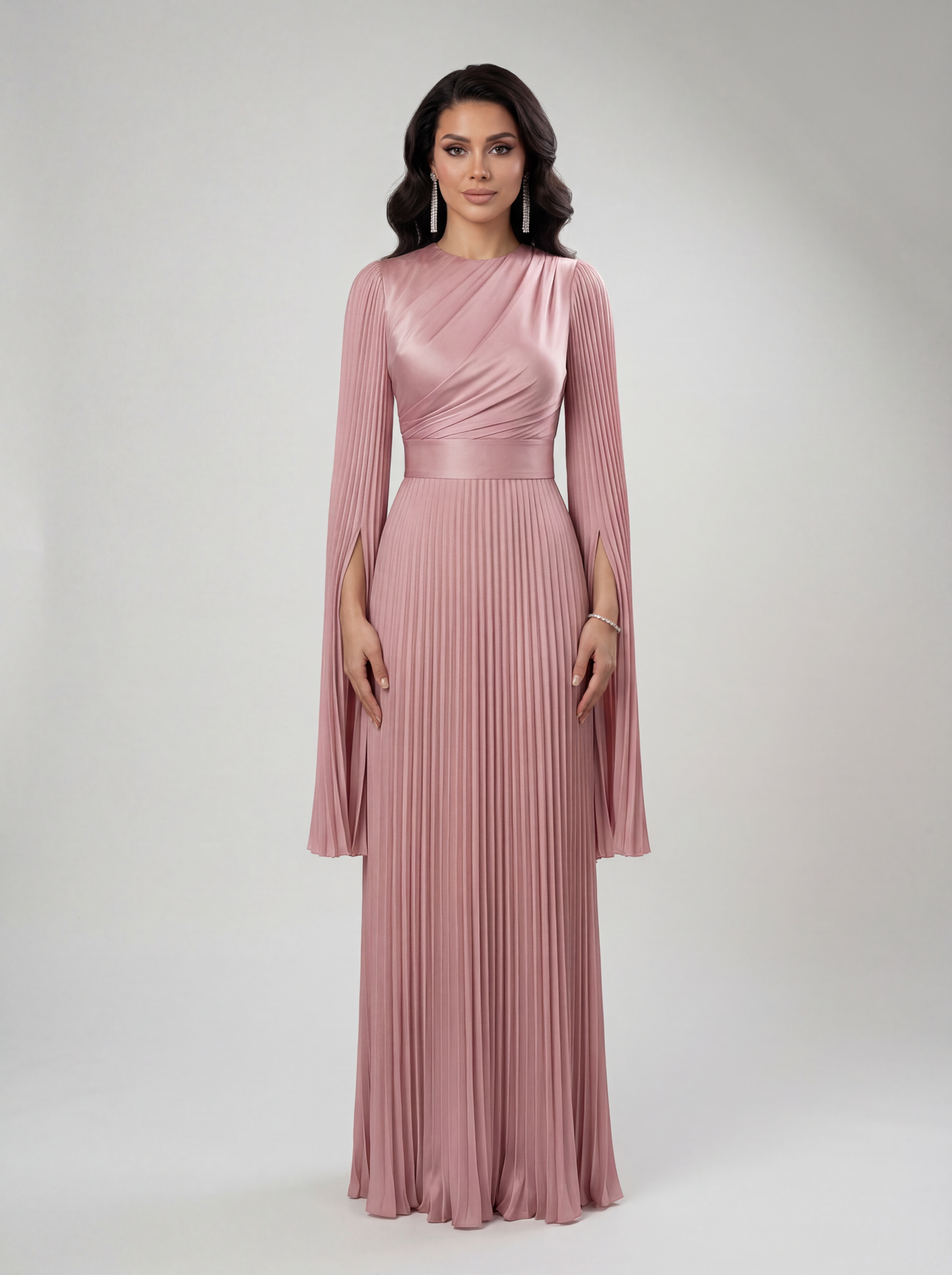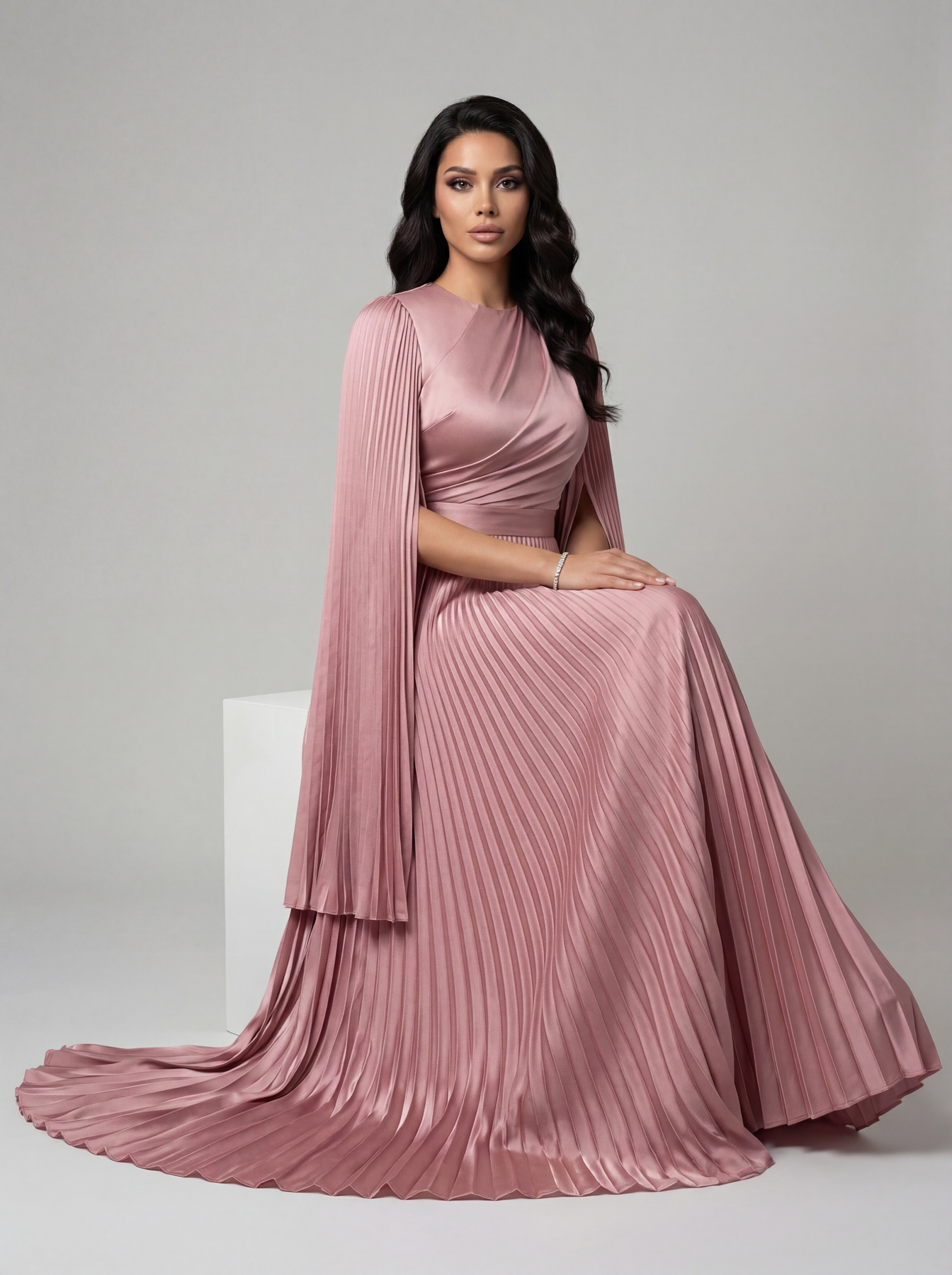 Crafted from lustrous pleated satin that flows with every movement, the Modest Pleated Satin Gown is your go-to for weddings, birthdays, and elevated evening events. The graceful pleats and long split satin sleeves create a refined silhouette that delivers understated luxury without saying a word.