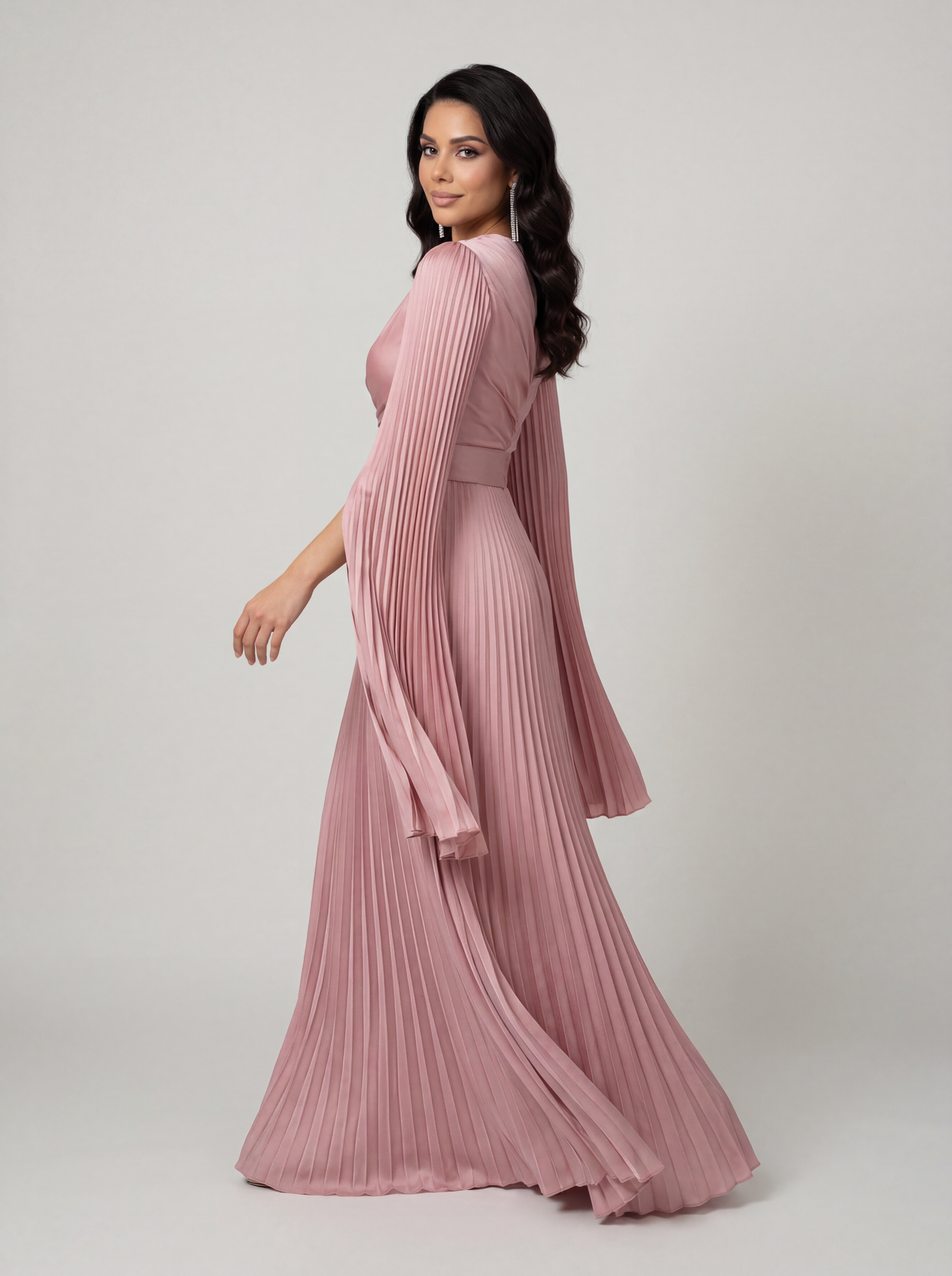 Modest Pleated Satin Maxi Dress - Evening Gown - Rose